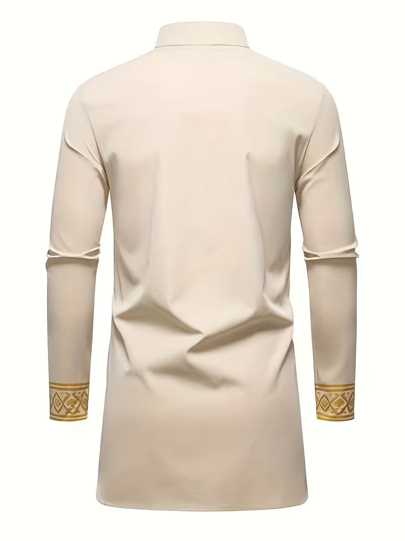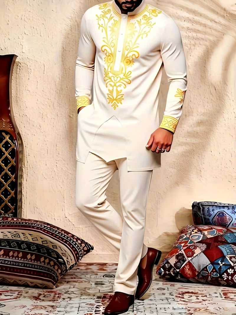Elevate your cultural or formal wardrobe with this Floral Embroidered Men's Traditional Two-Piece Set. The sleek base is adorned with intricate gold floral embroidery, merging heritage-inspired design with modern polished styling. Ideal for weddings, cultural ceremonies, or upscale gatherings—this set balances luxurious detail and traditional elegance.