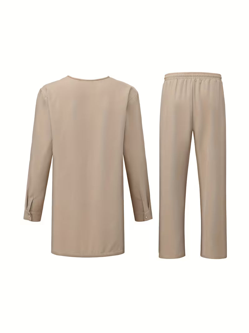 Beige And Silver Geometric Embroidered Men's Traditional Two-Piece Set