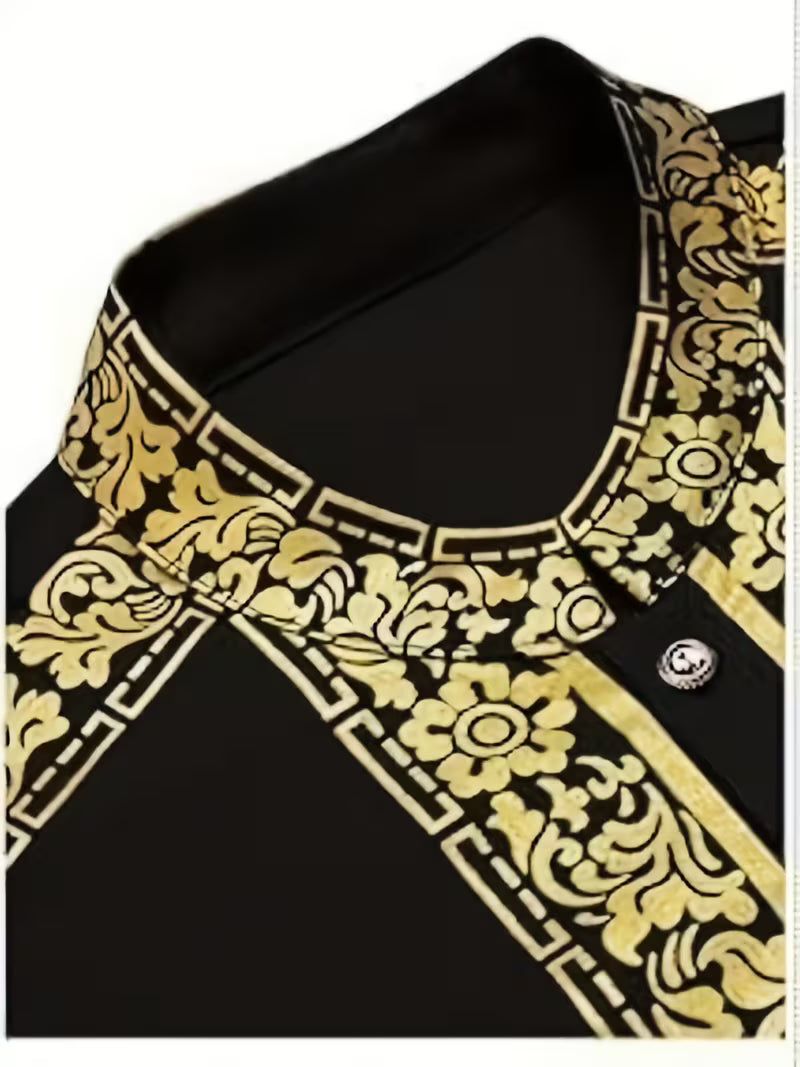 Elevate your formal or cultural wardrobe with this Black & Gold Ornate Scroll Men's Traditional Two-Piece Set. The sleek black base is adorned with full-panel gold floral-scroll embroidery, merging timeless regal detail with modern tailored styling. Ideal for weddings, cultural ceremonies, or upscale formal gatherings—this set balances luxurious design and polished sophistication.