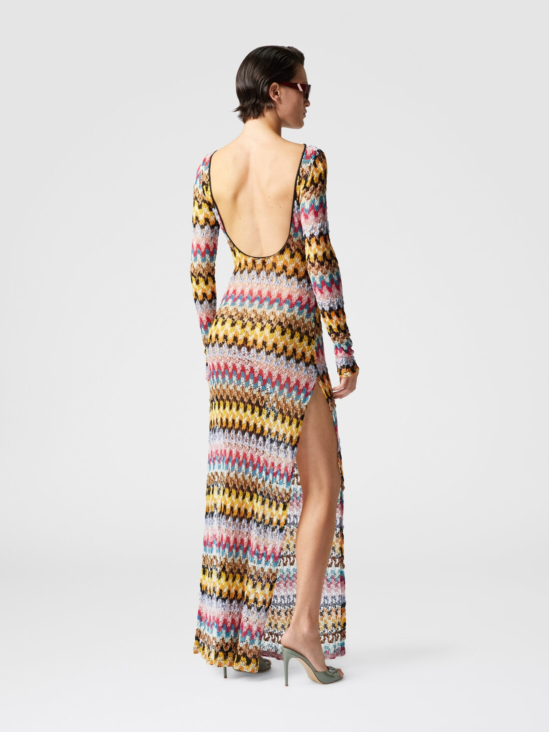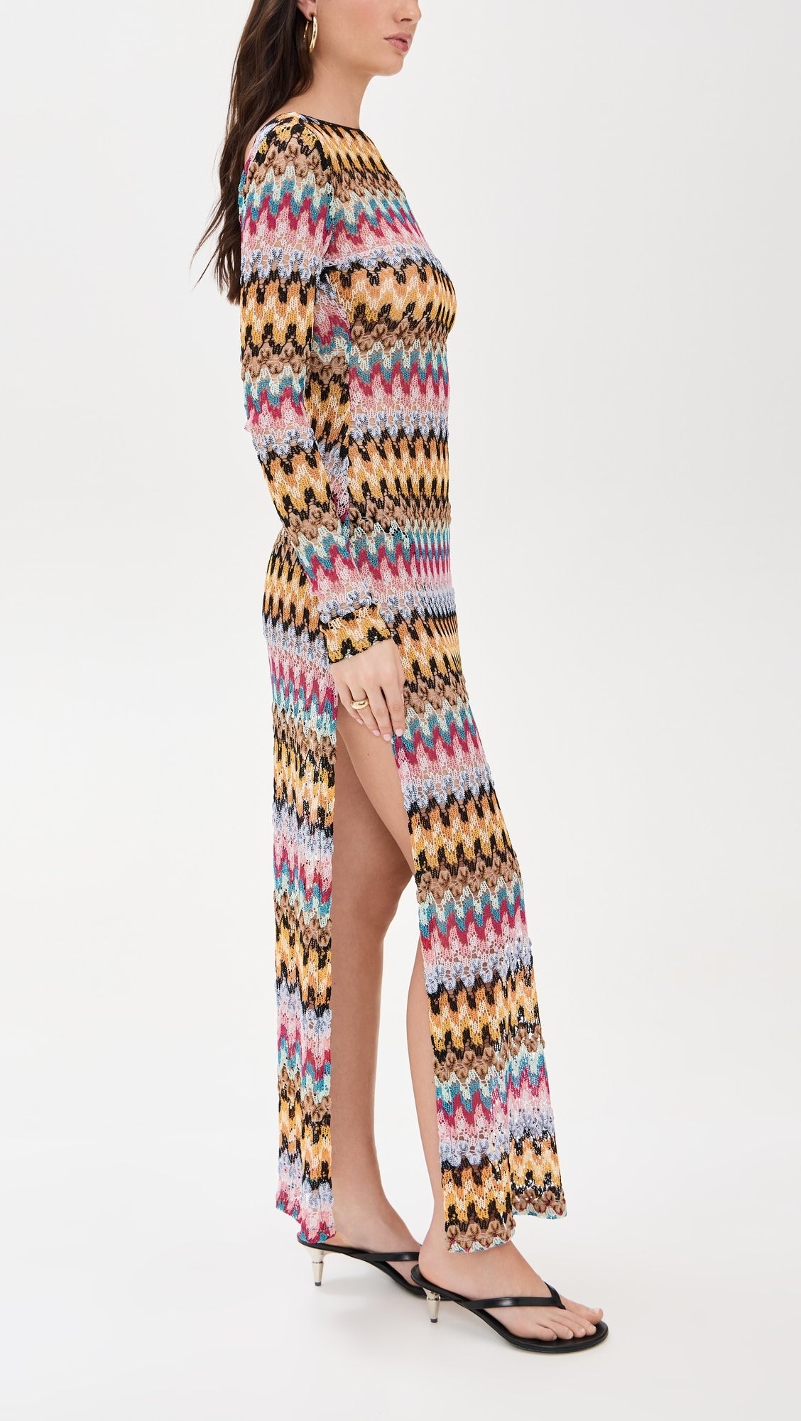 This maxi dress features a boat neckline and long sleeves, crafted from a fabric adorned with a vibrant chevron pattern in shades of yellow, brown, pink, blue, and other colors. The dress has a form - fitting silhouette and includes a high side slit, adding a touch of allure. Paired with green strappy sandals and sunglasses, it creates a stylish look suitable for semi - formal events, outdoor parties, or a fashionable day out.