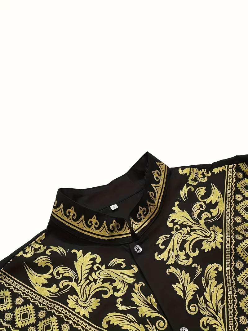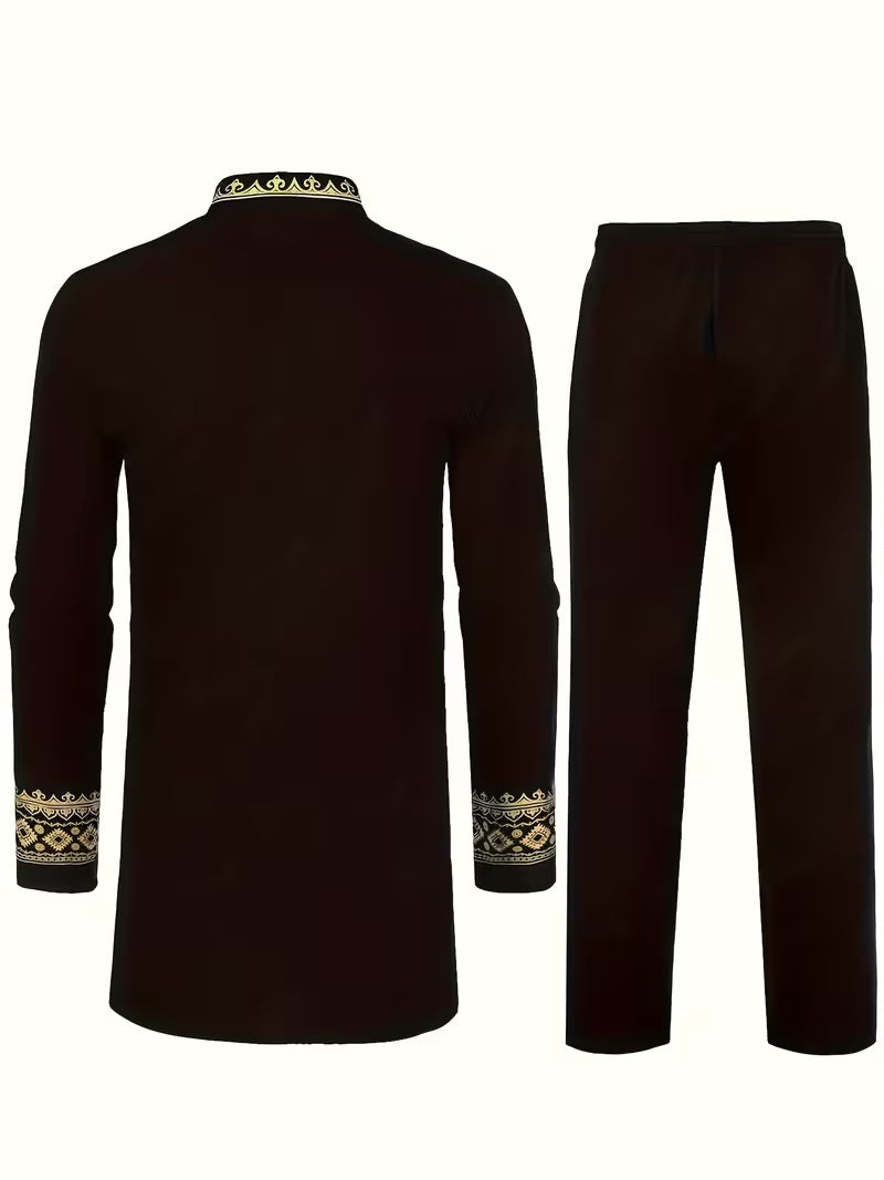 Stand out in urban style with this Chocolate Brown & Gold Embroidered Men's Casual Formal Set. The rich chocolate base is elevated by intricate gold floral-and-geo embroidery, blending cultural-inspired detail with modern streetwear polish. Ideal for upscale casual outings, cultural events, or statement-making daily looks—this set balances luxury and comfort seamlessly.