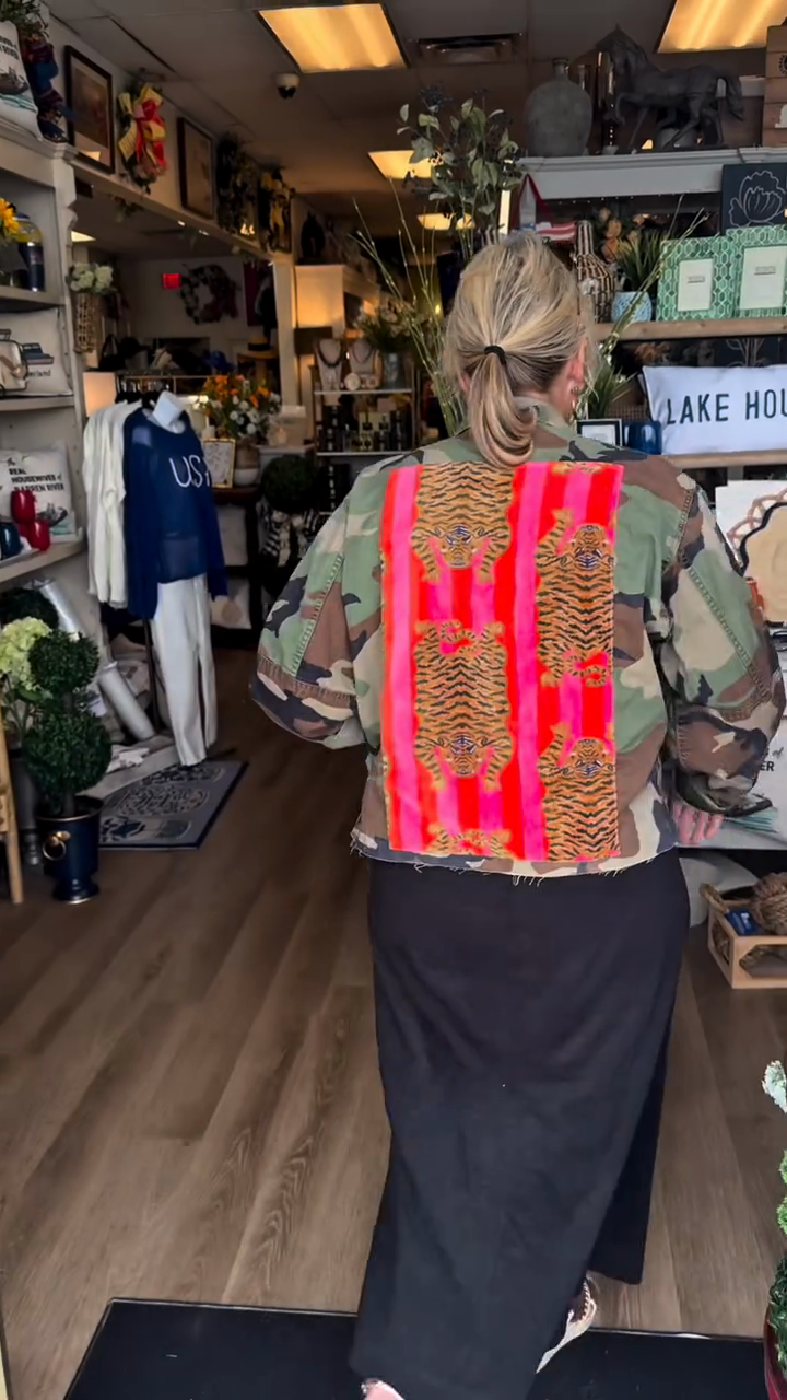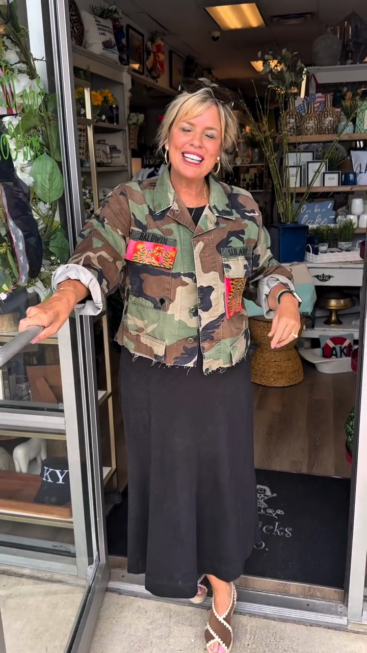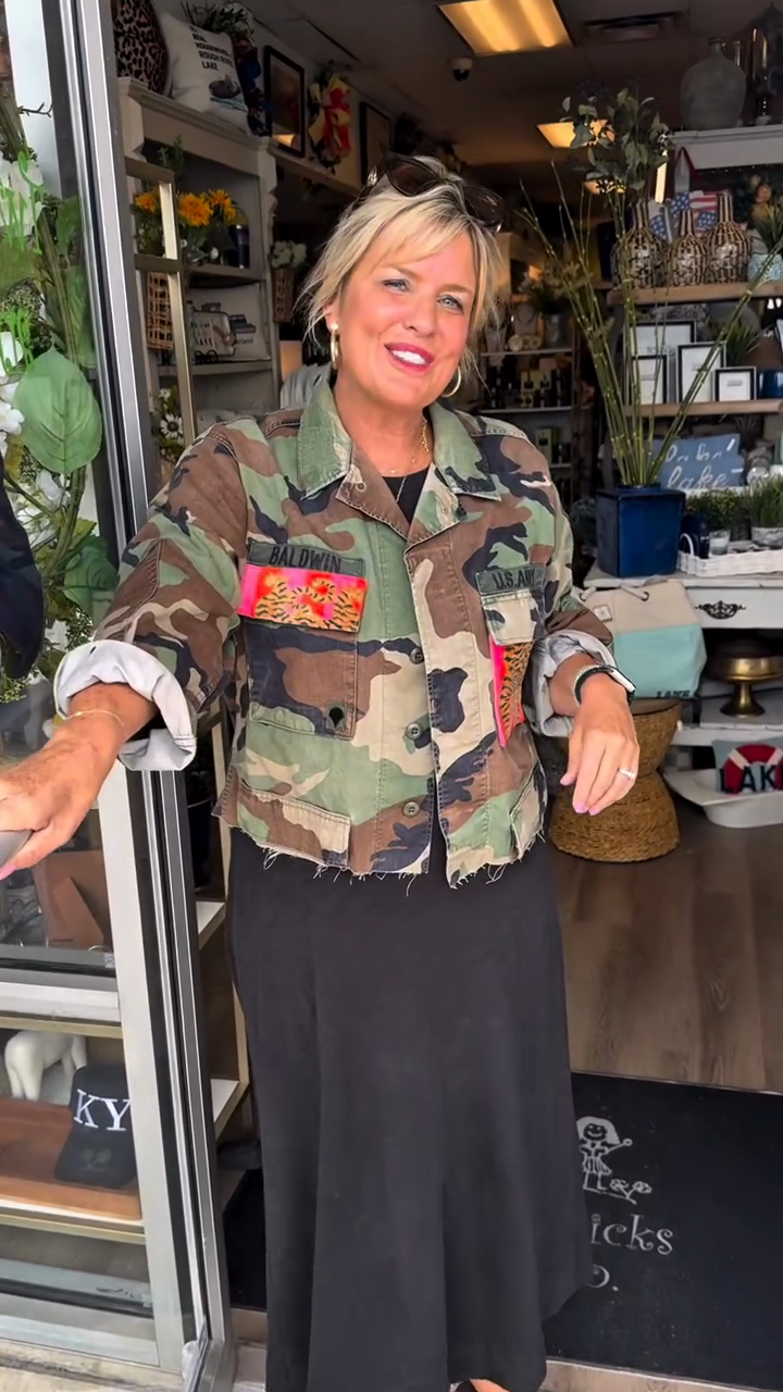 • Embellished Camouflage Jacket: Adds a bold and personalized touch with patches and frayed hem.