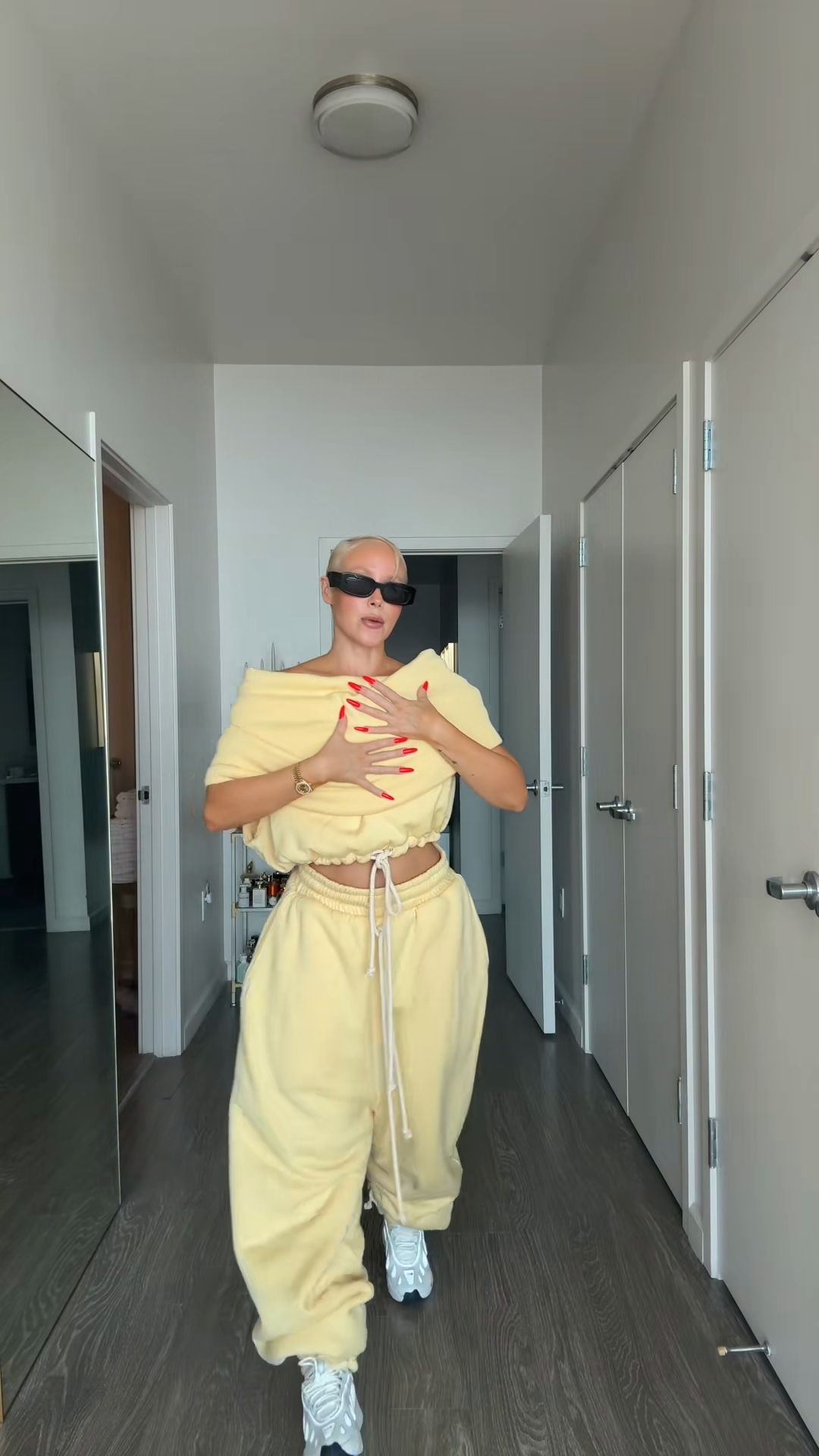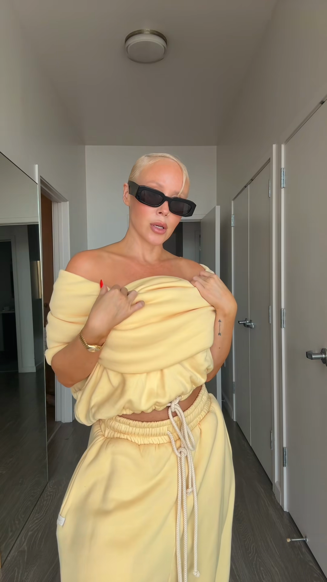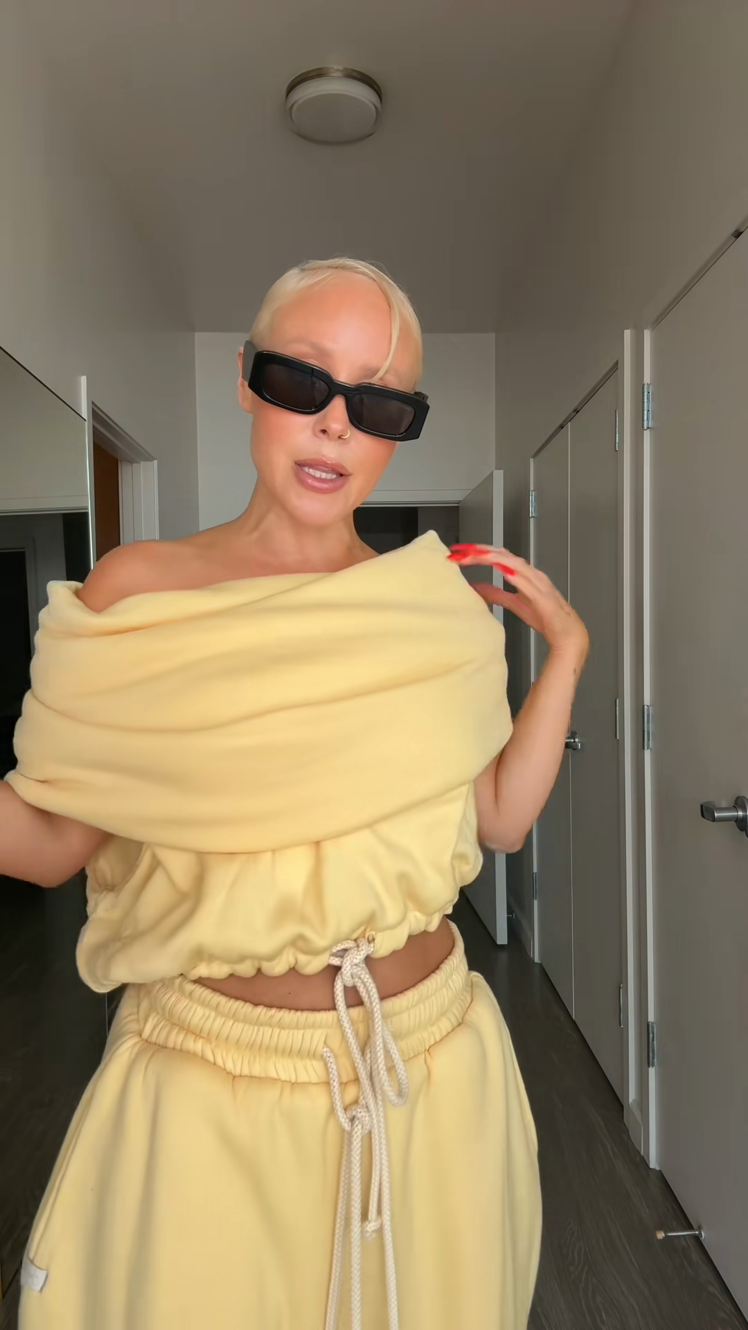 This stylish set features a soft, off - the - shoulder cropped top paired with matching drawstring joggers, both in a cheerful light yellow hue. The top has a relaxed fit, while the joggers offer a comfortable, slouchy silhouette with adjustable drawstrings at the waist.