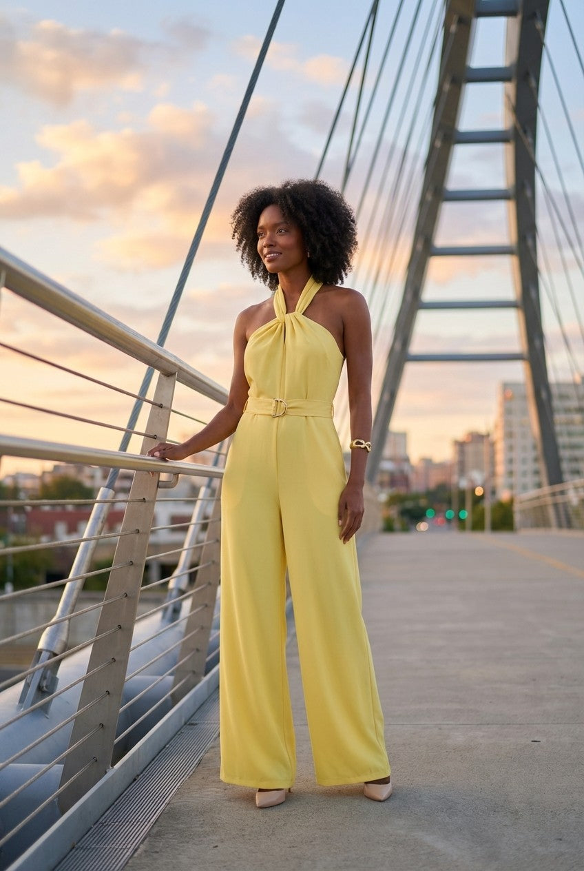 Radiate effortless sophistication. This stunning pale yellow jumpsuit captures the essence of modern elegance with its flattering halter neckline and flowing wide-leg silhouette.