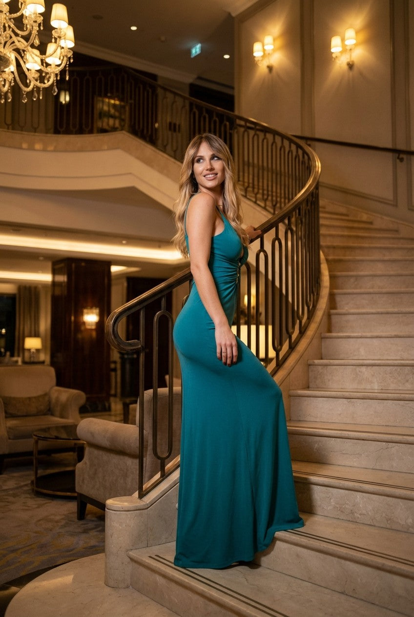 Sophisticated allure meets modern design. This floor-skimming teal maxi dress is defined by its daring front cut-outs and elegant gold-tone hardware. Perfectly tailored to accentuate your curves, it is an essential piece for any evening wardrobe.