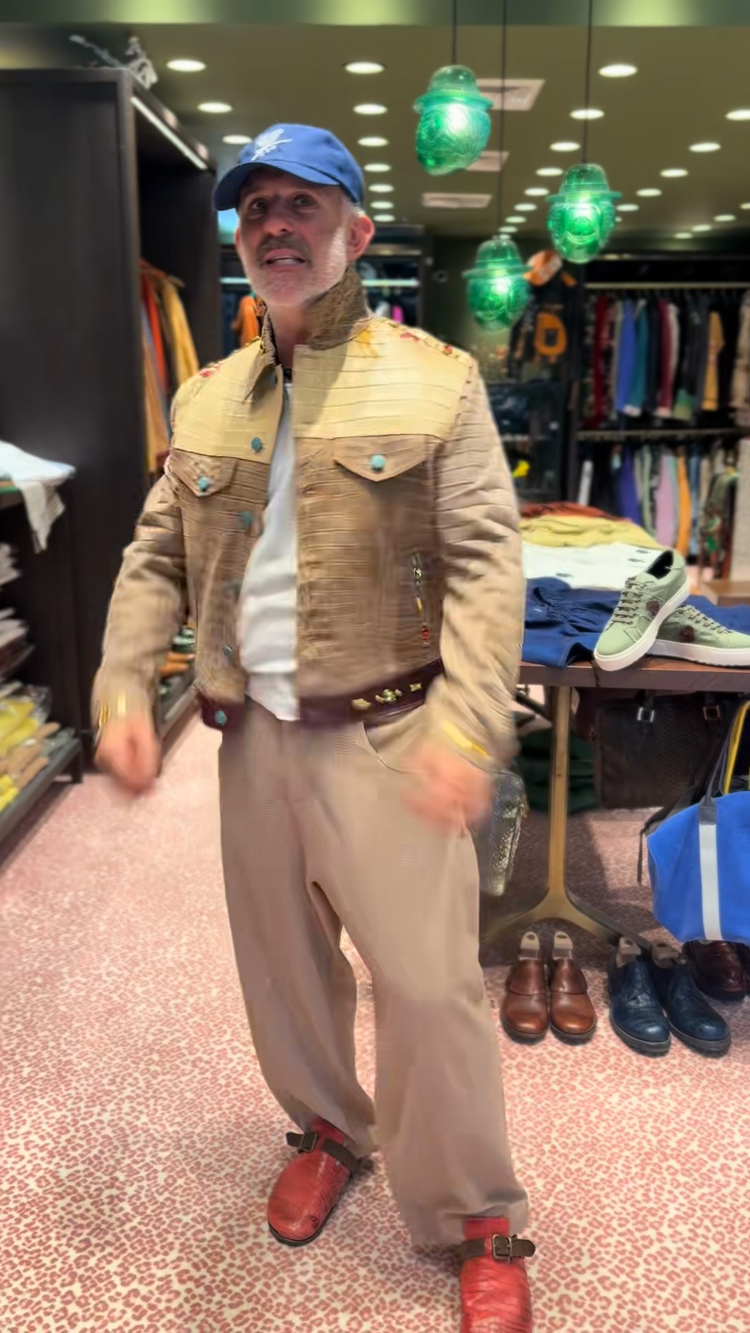 This tan denim jacket features intricate embroidery details, adding a unique and stylish touch. It has a classic denim - jacket silhouette with a button - up front, two chest pockets, and decorative buttons. Paired with a white T - shirt, beige trousers, and red shoes, and accessorized with a blue cap, it creates a casual yet fashionable look suitable for shopping outings or casual social events.
