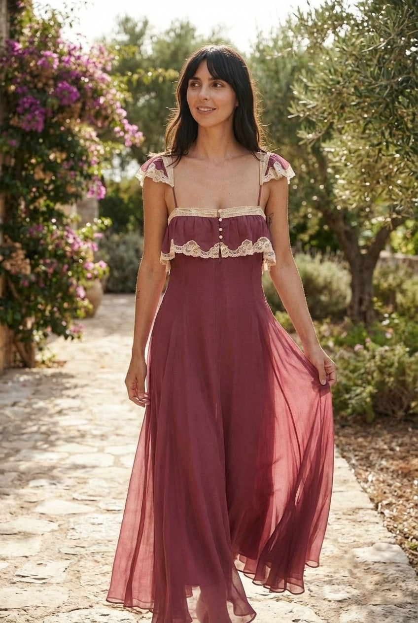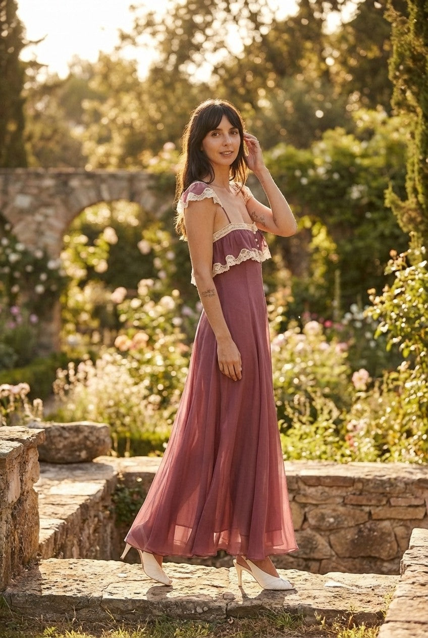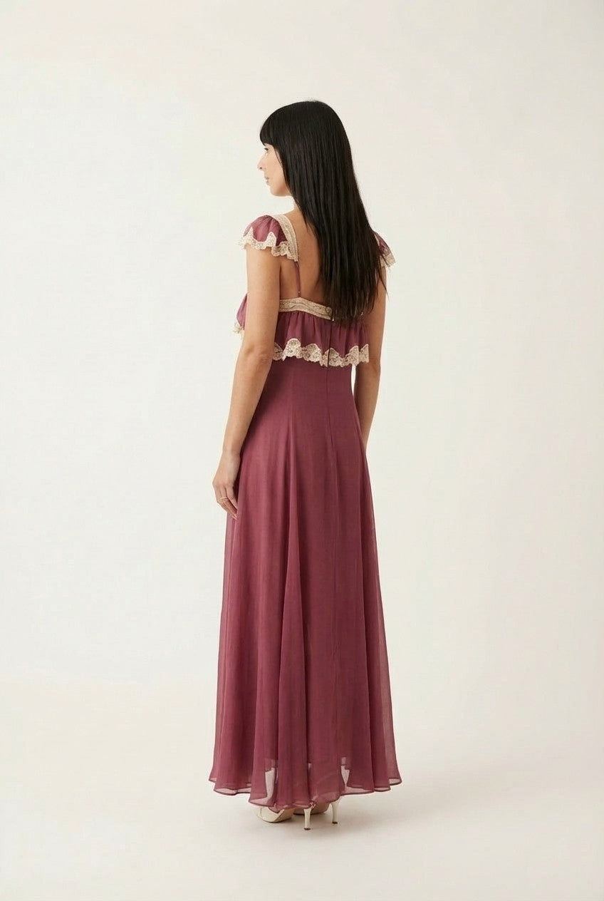 Step into a world of vintage-inspired elegance. This stunning mauve maxi dress features intricate cream lace trim and a flowing chiffon silhouette that radiates feminine grace.