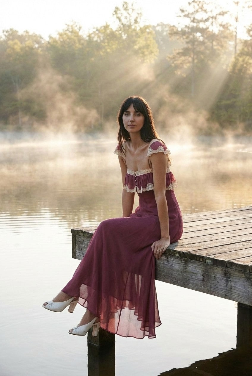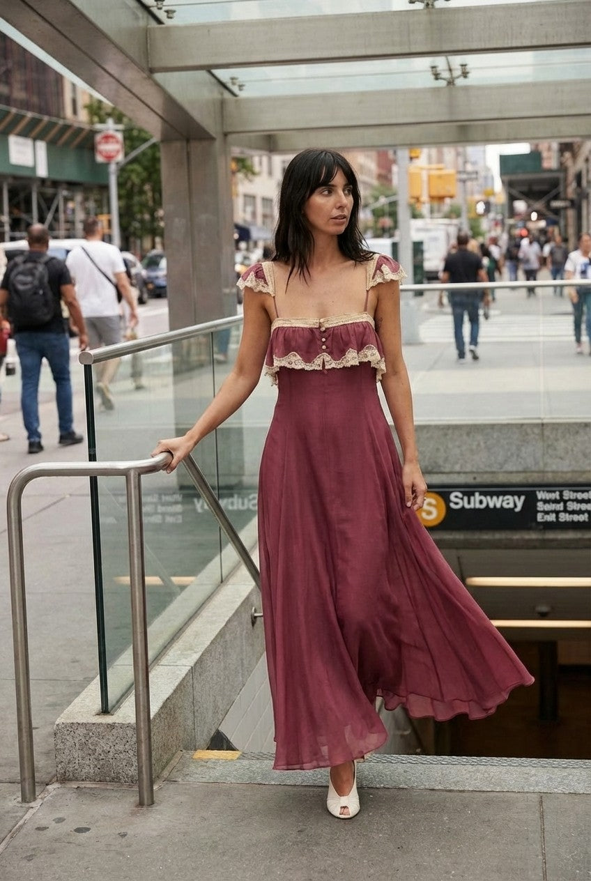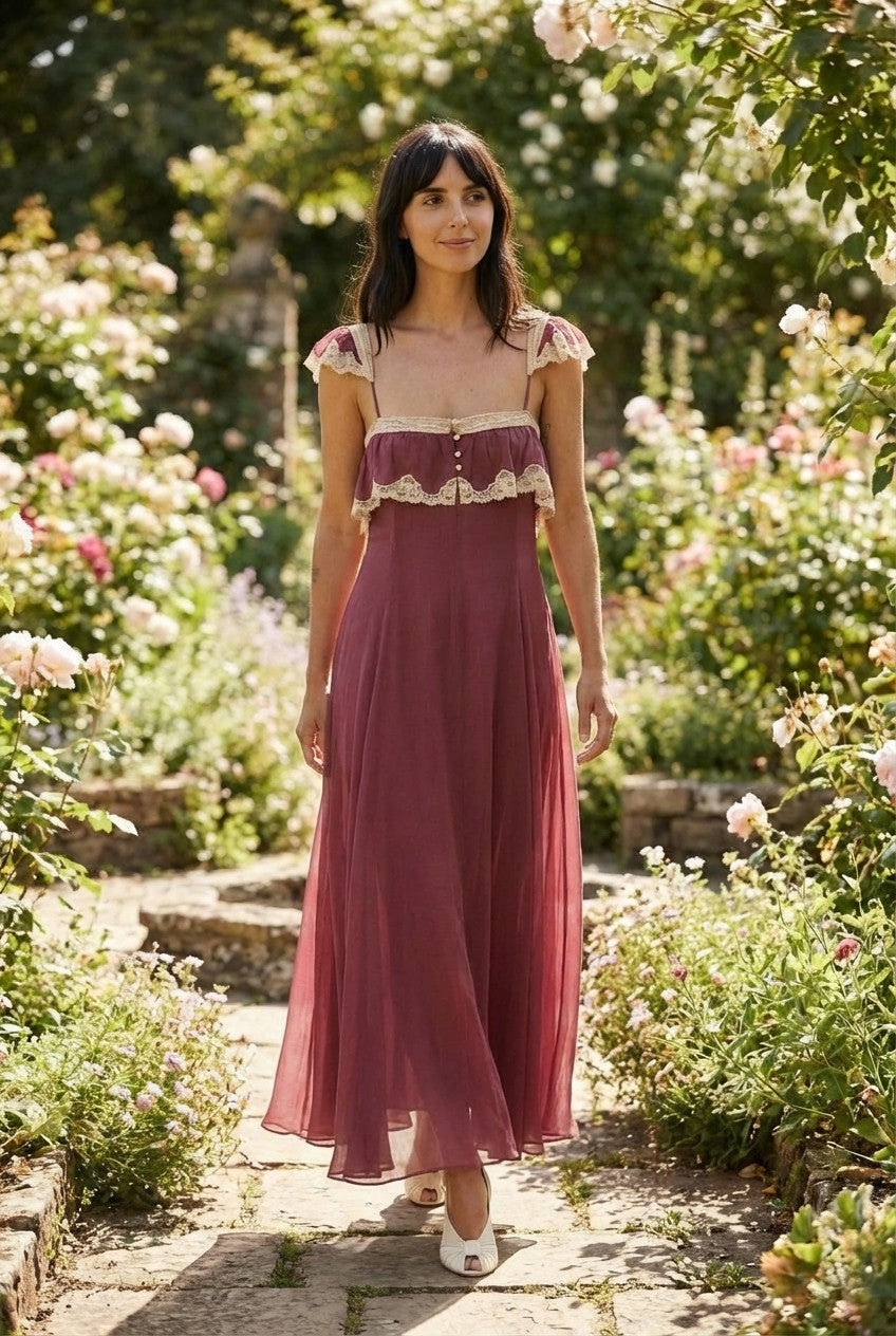Step into a world of vintage-inspired elegance. This stunning mauve maxi dress features intricate cream lace trim and a flowing chiffon silhouette that radiates feminine grace.