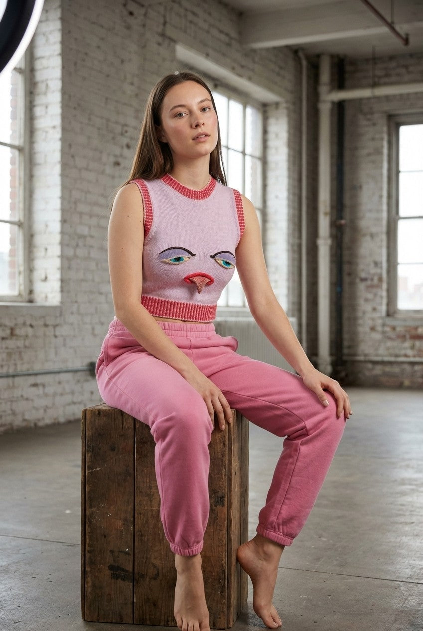 Expressive style meets artisanal craftsmanship. This unique ribbed knit vest features a whimsical embroidered face design, complete with a 3D textured tongue for an unforgettable statement piece.