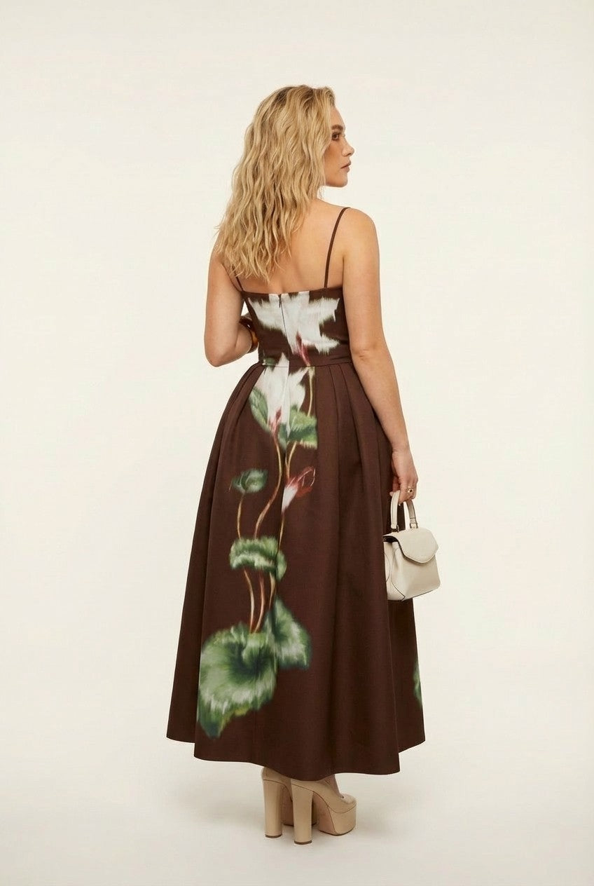 Botanical elegance meets timeless silhouette. This stunning chocolate brown maxi dress features a striking vertical floral print that elongates the frame. Designed with a fitted bodice and a sweeping pleated skirt, it is the ultimate statement piece for your next garden party or evening soirée.