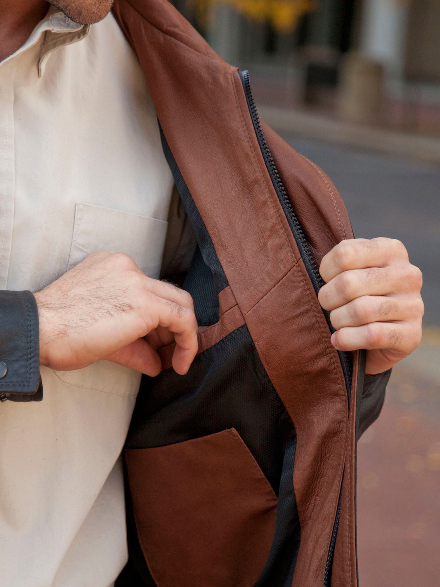A Lambskin leather bomber jacket crafted from smooth black leather and rich brown leather , featuring a sleek zip-front design. Blends sophisticated color blocking with classic bomber silhouette, fitting urban formal-casual outings, transitional season layering or polished daily styling—pair with a crisp white shirt to highlight the jacket’s refined two-tone texture.